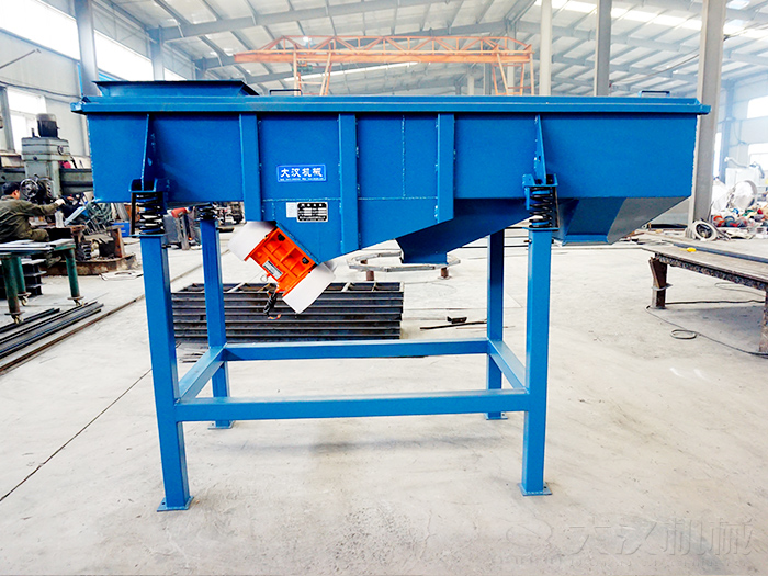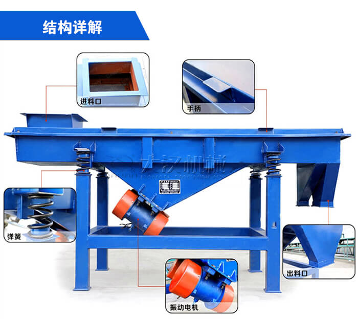 直線振動(dòng)篩主要由篩箱、篩框、篩網(wǎng)、振動(dòng)電機(jī)、電機(jī)臺座、減振彈簧、支架等組成。