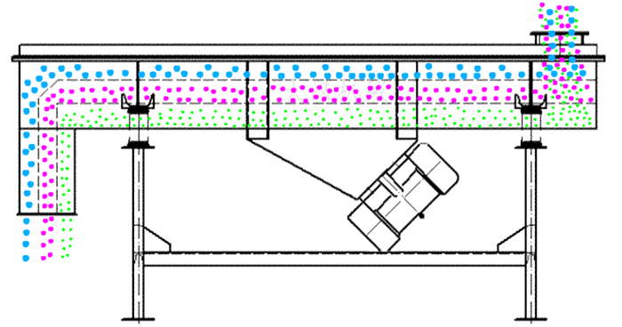 高頻直線篩采用雙振動(dòng)電機(jī)驅(qū)動(dòng),當(dāng)物料從給料機(jī)均勻地進(jìn)入篩分機(jī)的進(jìn)料口,在振動(dòng)電機(jī)的激振下,向出料口方向邊跳動(dòng)邊篩分,通過多層篩網(wǎng)篩分出數(shù)種產(chǎn)品和不合格的篩上、篩下物,分別從各自的出口排出,流入料倉或盛料筒,從而達(dá)到對(duì)物料進(jìn)行篩選和分級(jí)的目的。