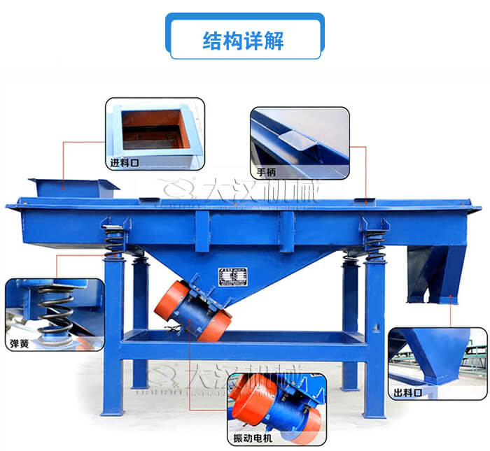 高頻直線振動(dòng)篩主要由篩箱、篩框、篩網(wǎng)、振動(dòng)電機(jī)、電機(jī)臺(tái)座、減振彈簧、支架等組成。