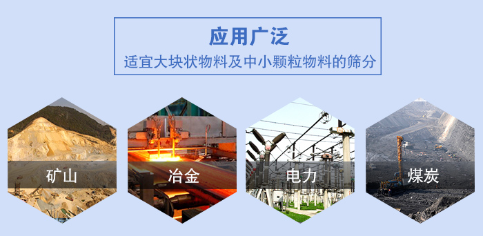 應用范圍:主要用于冶金、礦山、煤炭、建材、電力、化工等大塊狀物料及中小顆粒物料的篩分行業(yè)