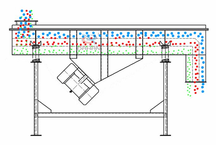 上振式直線振動篩是利用振動電機或普通電機外拖動或自振源驅動,使篩體沿激振力方向作周期性往復振動,物料在篩面上沿直線方向作拋物線運動,從而達到篩分目的。上振式直線振動篩由激振裝置、篩箱、防塵罩、落料斗、減振裝置、底座等部分組成。上振式直線振動篩工作時,由激振器產(chǎn)生的激振力通過篩箱傳遞給篩箱內的篩面上,因激振器產(chǎn)生的激振力為縱向力,迫使篩箱帶動篩網(wǎng)面作縱向前后位移,在一定條件下,篩網(wǎng)面上的物料因受激振力作用而被向前拋起,落下時小于篩孔的物料則透篩而落到下層,物料在篩網(wǎng)面上的運動軌跡為拋物運動,由于這樣周而復始的物料運動,物料從入料端落入篩箱后,迅速前進、松散、透篩,完成篩分作業(yè)。