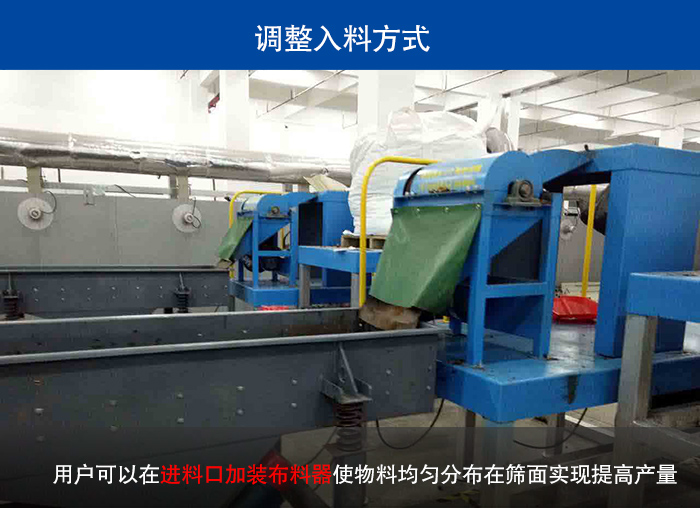 在玉米篩選過(guò)程中如給料不均勻,入料時(shí)不是沿全網(wǎng)寬度給入就會(huì)造成篩面利用率不充分從而降低產(chǎn)量和篩分精度。對(duì)于這問(wèn)題用戶(hù)可以在進(jìn)料口加裝布料器使物料均勻分布在篩面實(shí)現(xiàn)提高產(chǎn)量的要求,如無(wú)條件增加布料裝置可以在人工投料時(shí)注意均勻分散。