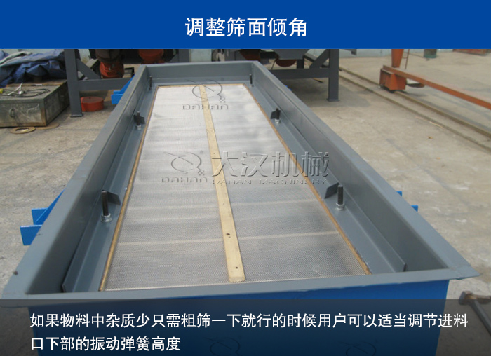 直線(xiàn)振動(dòng)篩在設(shè)計(jì)時(shí)是有個(gè)傾斜角度的,通常情況下傾角為45°,但在實(shí)際使用過(guò)程中如果物料中雜質(zhì)少只需粗篩下就行的時(shí)候用戶(hù)可以適當(dāng)調(diào)節(jié)進(jìn)料口下部的振動(dòng)彈簧高度,進(jìn)料口高度升高可以加快物料在篩面的運(yùn)動(dòng)從而實(shí)現(xiàn)提高產(chǎn)量的效果。