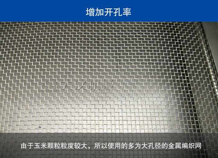 由于玉米顆粒粒度較大,所以使用的多為大孔徑的金屬編織網(wǎng),在生產(chǎn)過(guò)程中想要提高產(chǎn)量也可以更換較之前孔徑較大的篩網(wǎng)進(jìn)行生產(chǎn),這樣也可以有效的提高玉米直線(xiàn)振動(dòng)篩的產(chǎn)量。