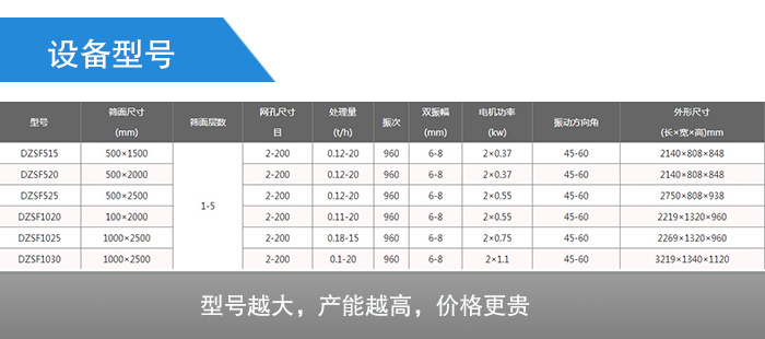 方形振動篩型號有DZSF515、DZSF520、DZSF525、DZSF1020、DZSF1025、DZSF1030,每型號設(shè)備的篩網(wǎng)面積、機(jī)重、電機(jī)功率,產(chǎn)量等均有差異,因此其制造成本也會不樣,那么價格當(dāng)然也是參差不齊,型號越大,產(chǎn)能越高,價格更貴。