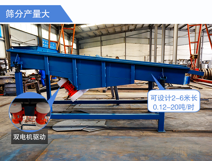 干河沙篩分產(chǎn)量般比較大,這取決于其應用場景,直線振動篩為雙電機驅動,物料在篩面上受激振力的作用向前跳躍,長度根據(jù)精細度要求不等可設計:2-6米長,干河沙直線振動篩型號有DZSF515、DZSF520、DZSF525、DZSF1020、DZSF1025、DZSF1030,每小時產(chǎn)量范圍在0.12-20噸。