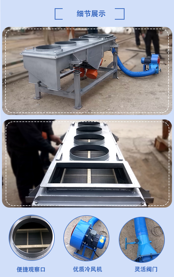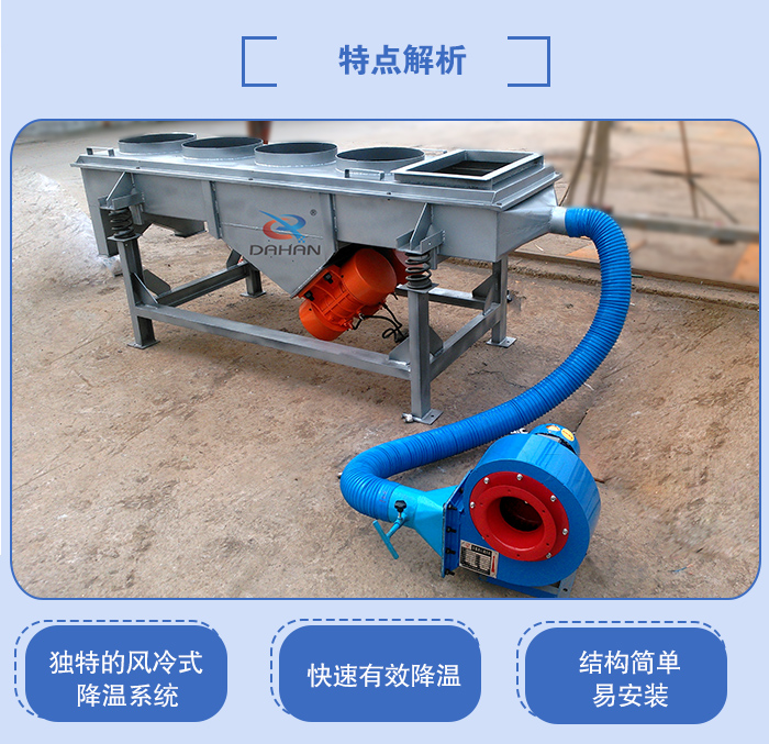 2、獨特的風冷式降溫系統(tǒng)設計,快速有效降溫,降溫后篩分效率更高;