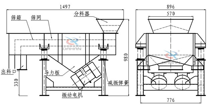本篩機主要由篩箱、篩框、篩網(wǎng)、振動電機、電機臺座、減振彈簧、支架等組成。